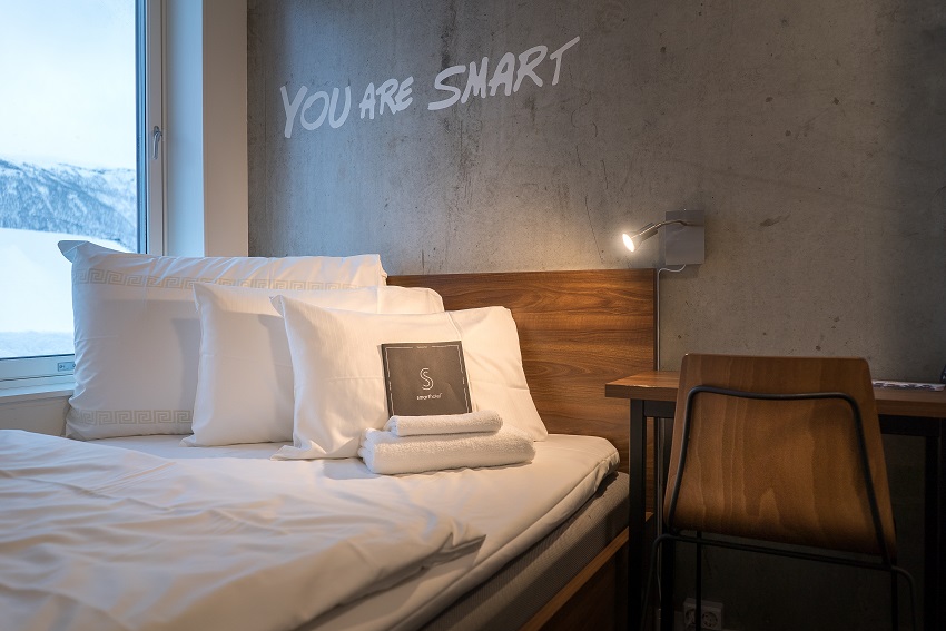 Bo på Smarthotel Tromsø, et stilig og komfortabelt hotell midt i Tromsø sentrum. Hotellet har 160 rom og kan tilby kostnadsfri Wi-Fi og sykler til fri disposisjon i tillegg til «snackstasjon» og restaurant. Interiørdesignen er i typisk nordisk stil, og hotellet støtter lokale entreprenører ved å hjelpe gjestene til å bestille turistopplevelser med dem.